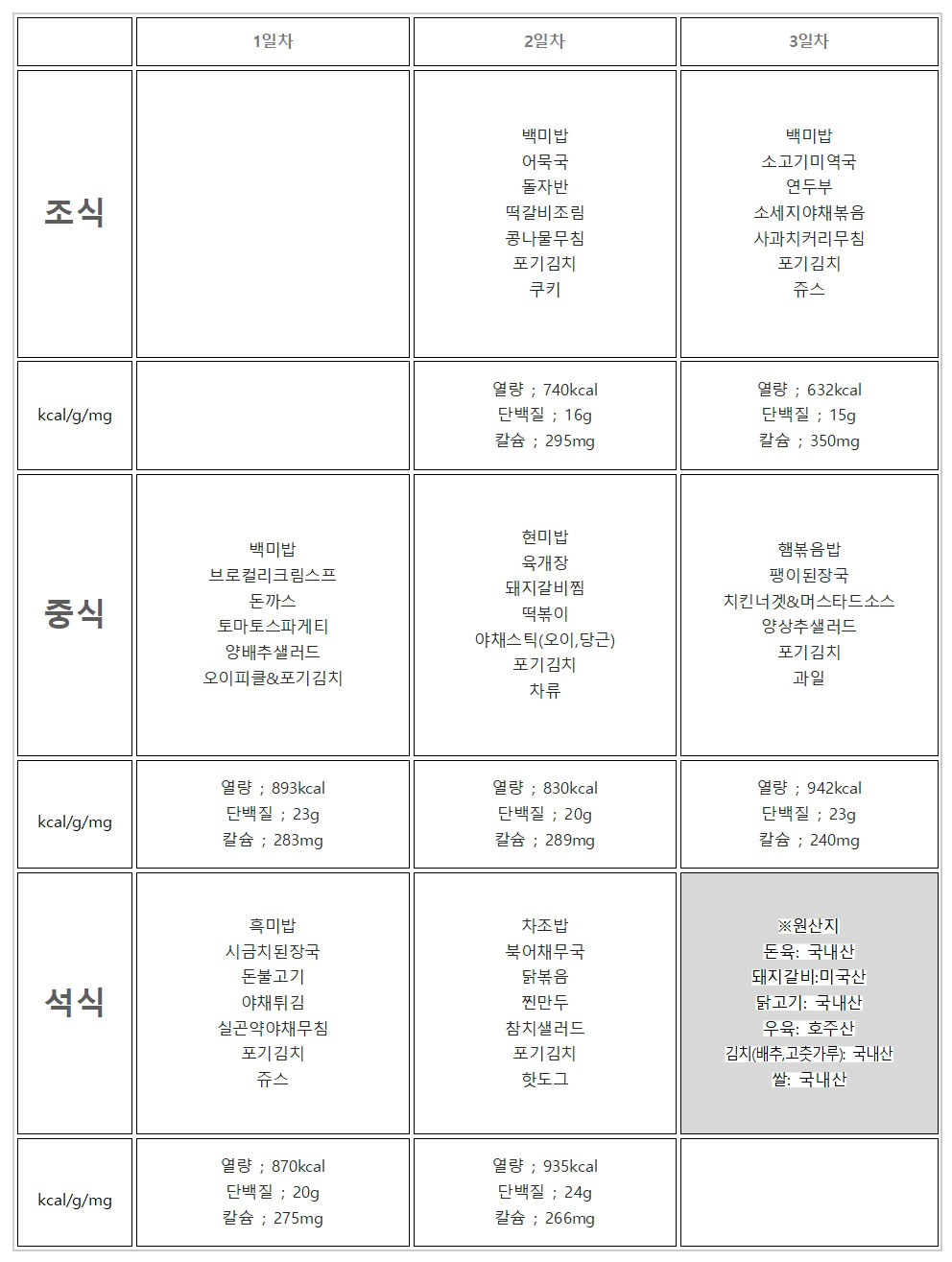 원산지(돈육: 국내산,돼지갈비:미국산,닭고기: 국내산,우육: 호주산,김치(배추,고춧가루): 국내산,쌀: 국내산)