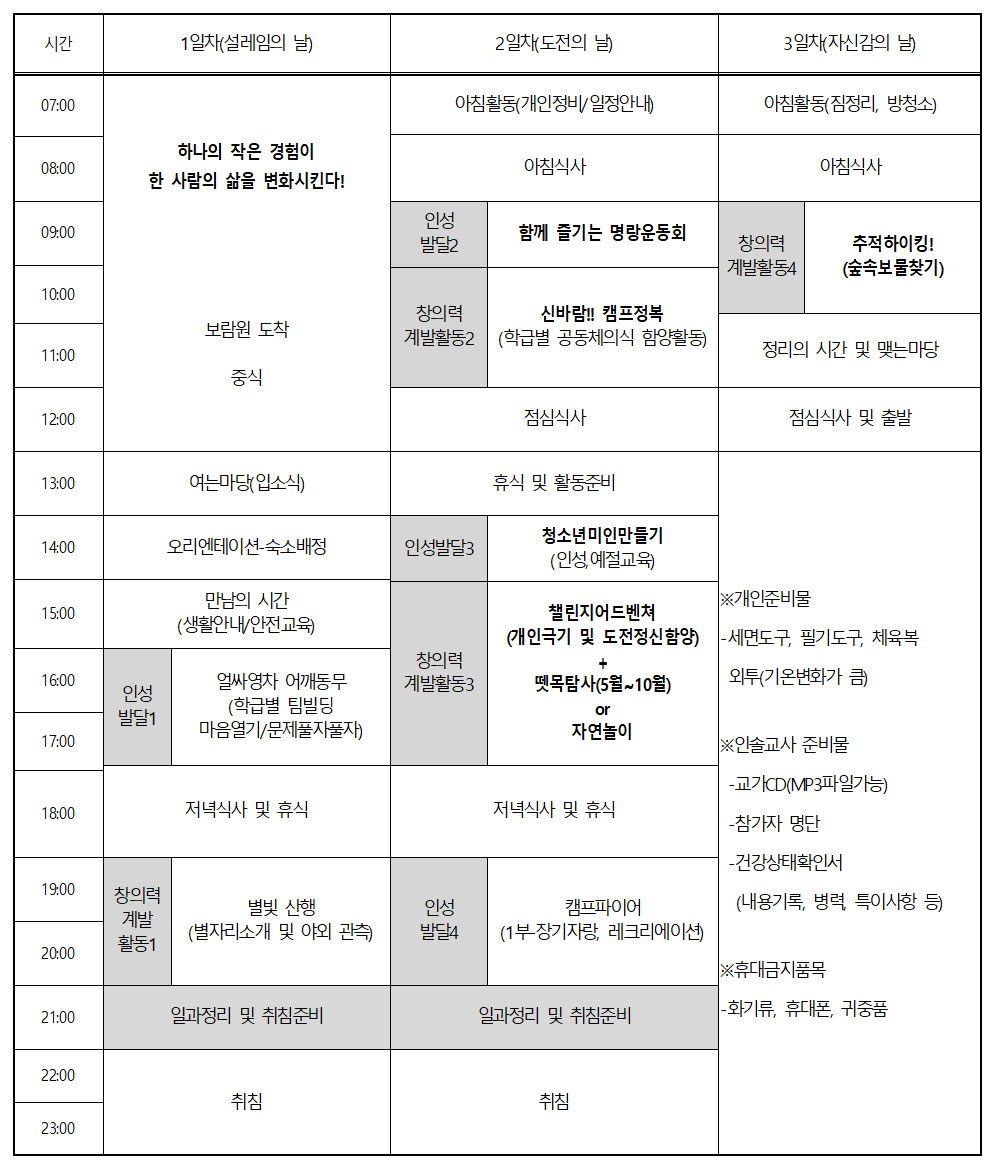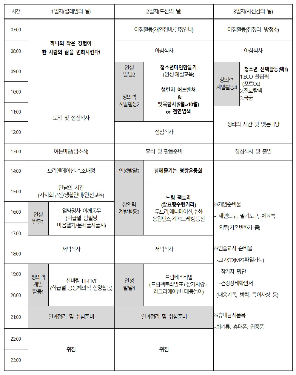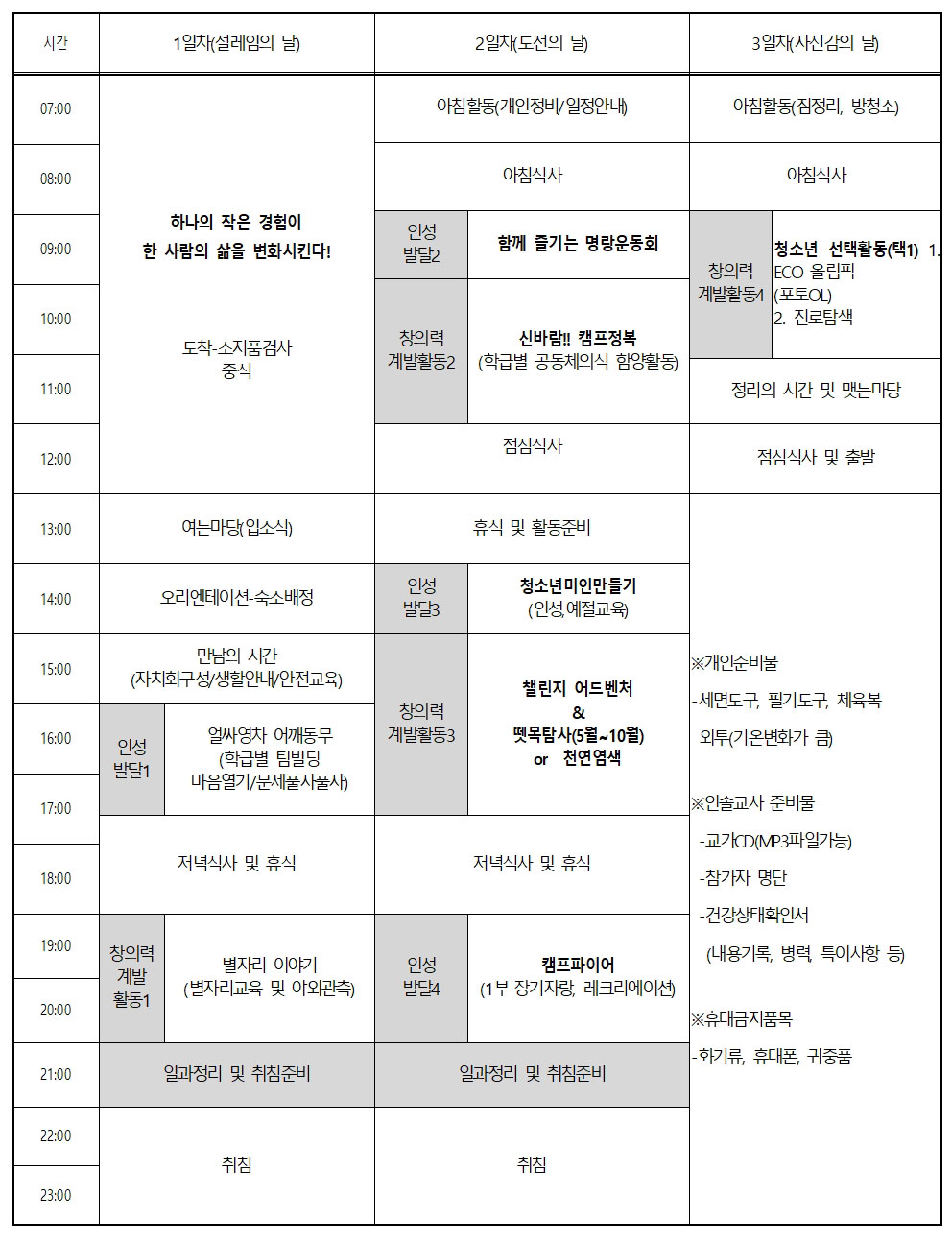 개인 | 세면도구, 필기도구, 체육복, 외투(기온 변화가 큼) |